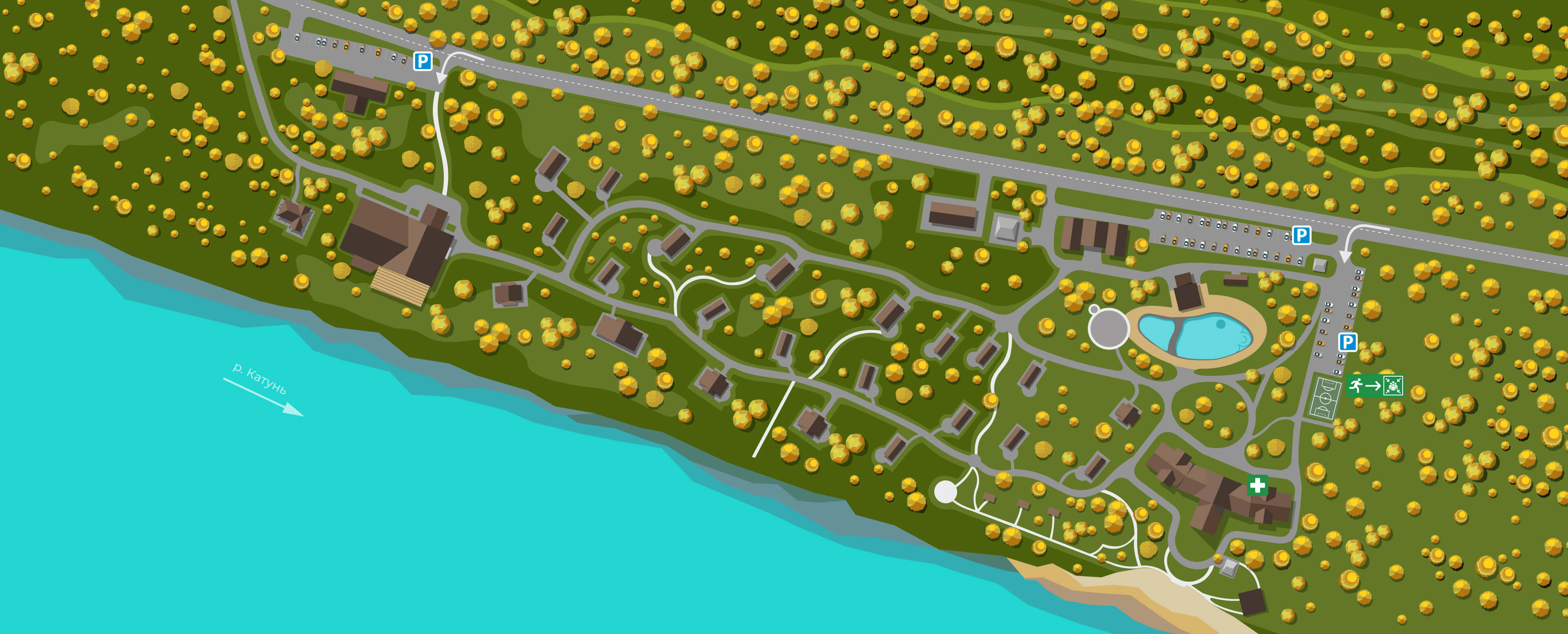 Основное здание комплекса выполнено из бруса алтайской сосны. Здесь 55 гостевых номеров различных категорий, панорамный ресторан с террасой и фитнес центр с самым современным оборудованием.