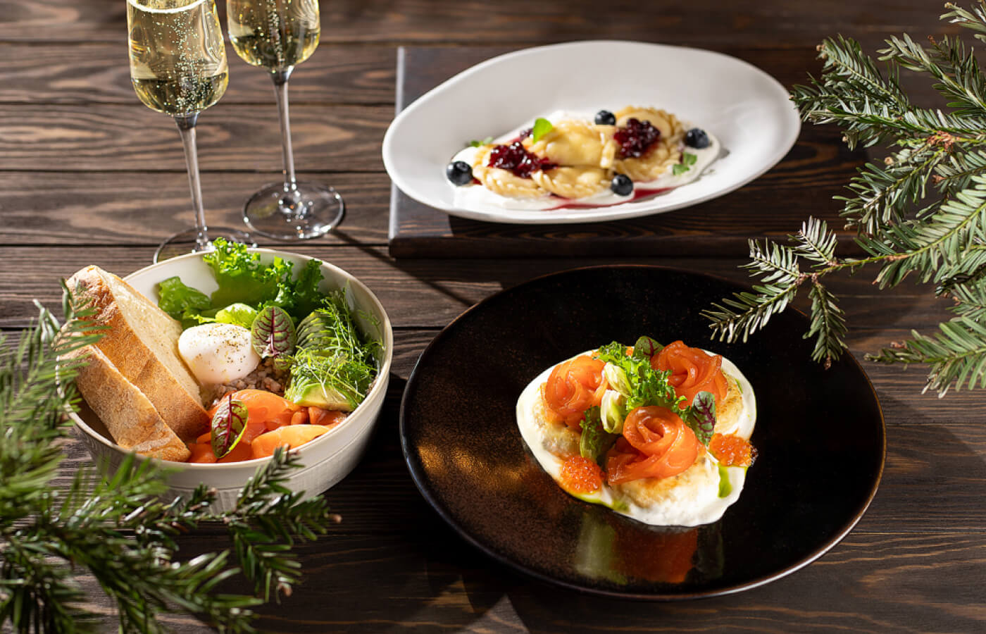 В этом году отель Grand Chalet Altay подготовил праздник в классическом русском стиле. Вас ждёт банкет с традиционными закусками отечественной кухни: сибирские разносолы, холодец с хреном, бутерброды с красной икрой, индигирка с тремя видами икры и паштет из дичи. А на горячее шеф-повар приготовит свои фирменные блюда: филе дикой форели с пюре и утиную грудку с кремом из сельдерея и брусничным соусом.